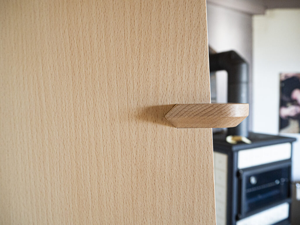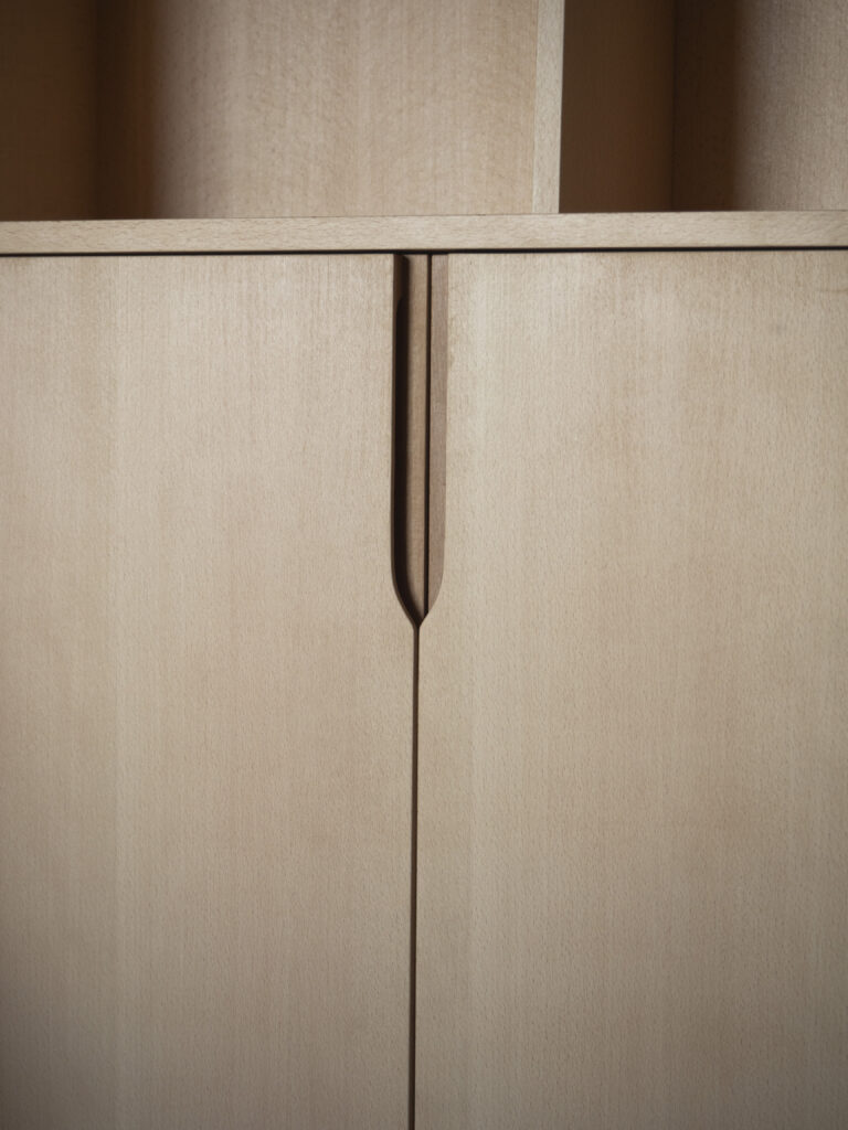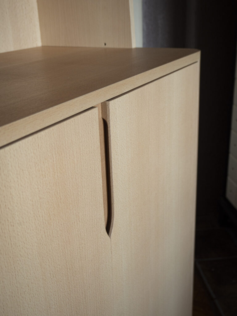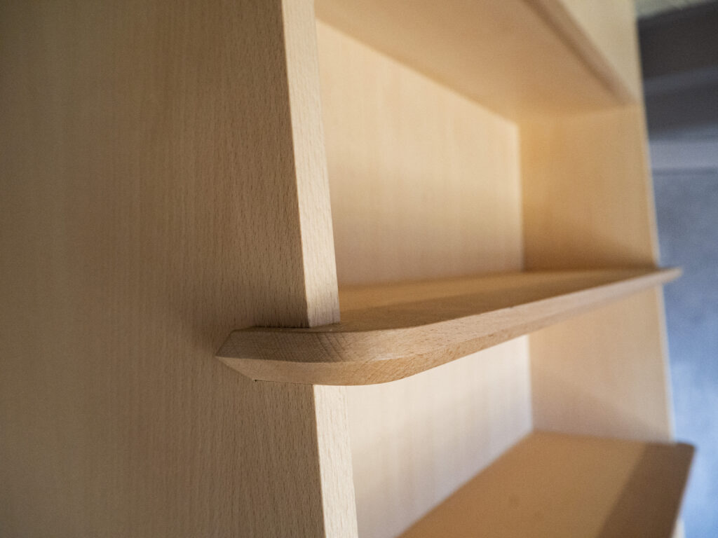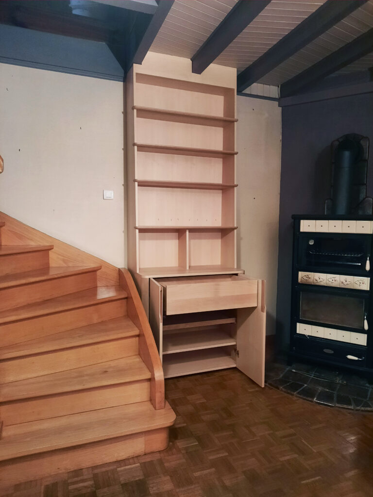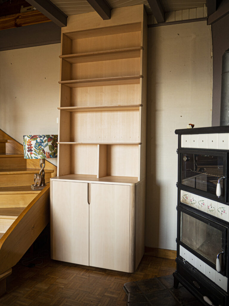 Cette bibliothèque sur-mesure est fabriquée en latté hêtre et en hêtre massif. Le meuble bas comprend une tablette coulissante et un tiroir pour ranger les CD.