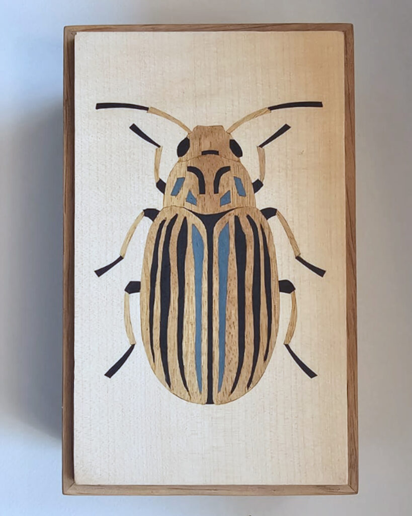 Cette boite représente un doryphore, coléoptère originaire du Mexique. Elle est réalisée en chêne massif. Son couvercle est marqueté en sycomore, poirier teinté dans la masse, et en movingui.