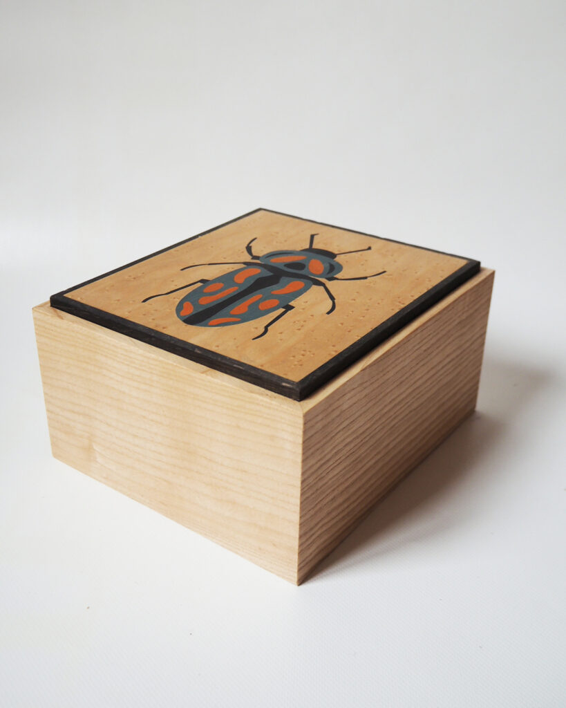 Cette boîte mesurant 20x22cm est réalisée en frêne massif. Son couvercle est marqueté avec différentes essences de bois : érable moucheté et poirier teinté dans la masse.